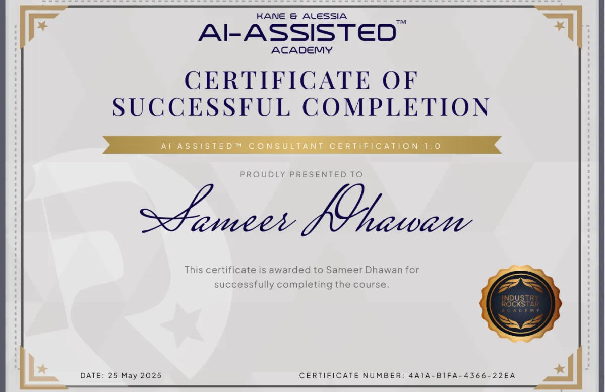Sameer Dhawan is a Certified AI Assisted™ Consultant, trained by Kane & Alessia’s AI Assisted™ Academy in delivering high-impact AI and automation strategies that generate measurable ROI.